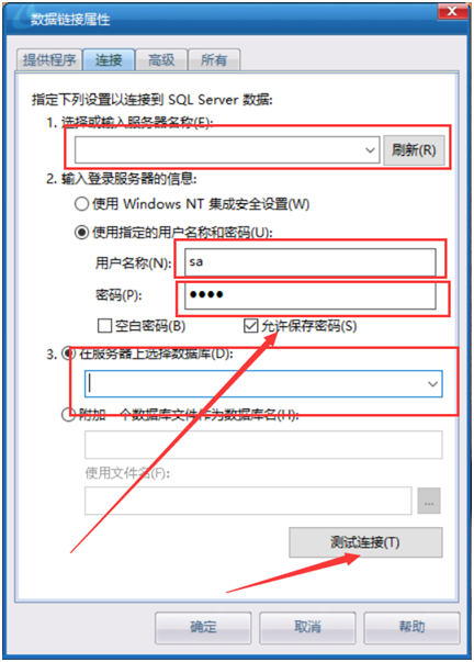 輸入服務器的IP地址,輸入紅框內的信息,然后點擊允許保存密碼,最后進行測試連接,看是否可以連接成功,連接成功后點擊確定。